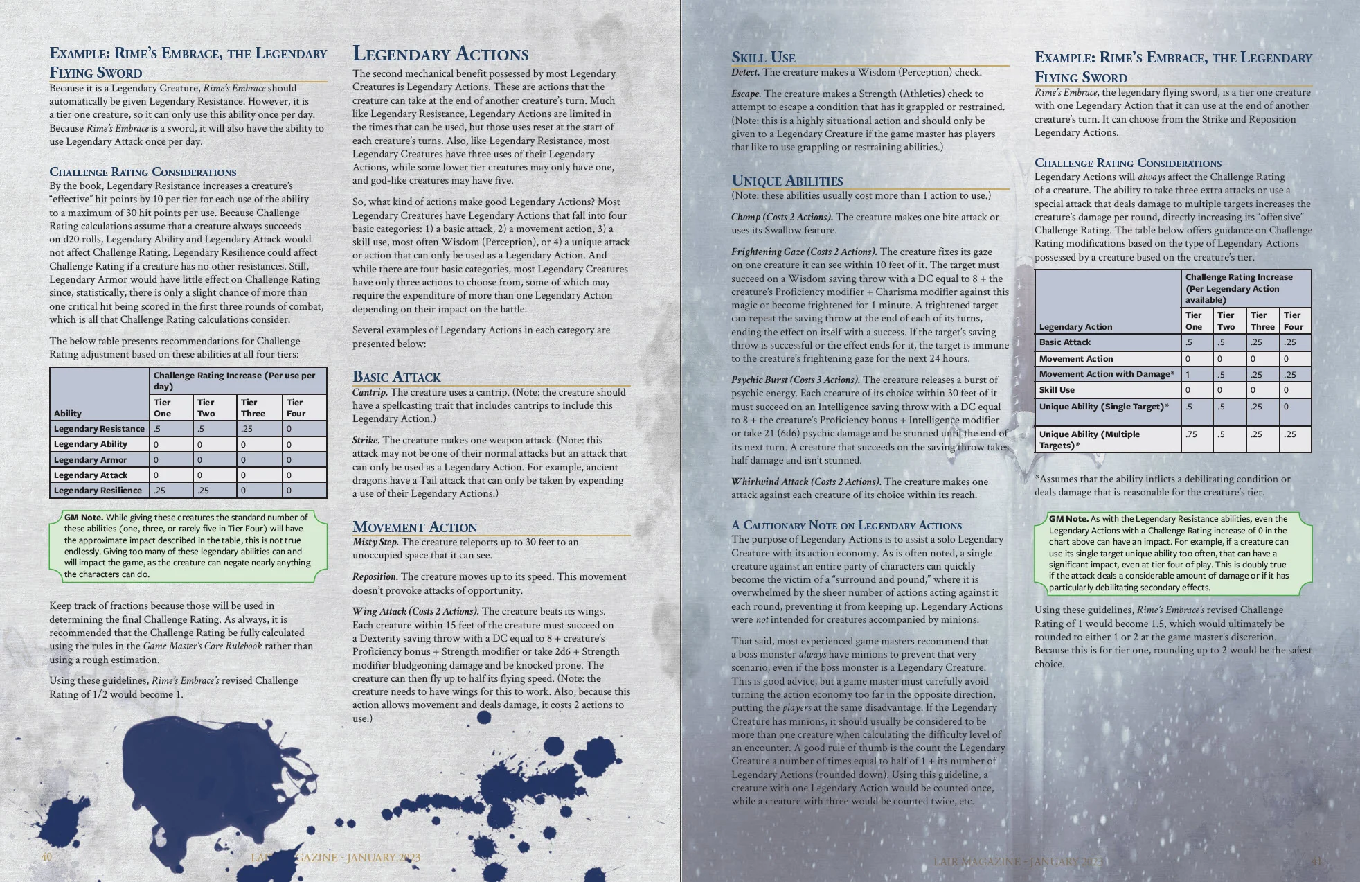 A Cut Above: Creating Legendary Creatures - This in-depth guide details everything you need to know to transform a standard creature's stat block into a legendary creature's stat block, including legendary resistances, legendary actions, lair actions, and more. It also provides an easy rule-of-thumb method to help GMs calculate what the new legendary creature's CR would be.