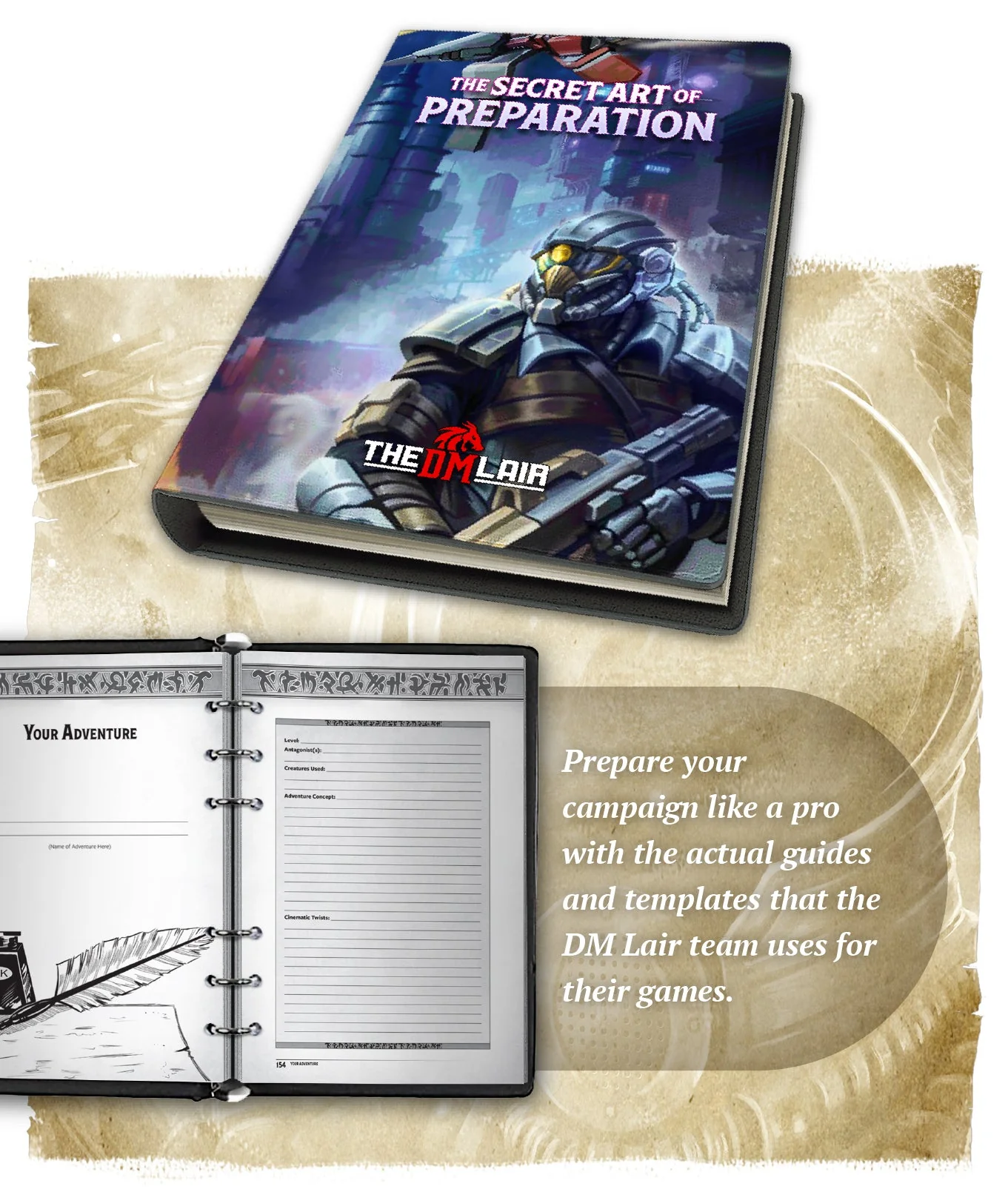 The Secret Art of Preparation. Brings to your fingertips the actual templates and guides that the DM Lair team uses to prepare games, Lair Magazine, and more. Designed as a three-ring binder, it's intended for you to write directly into for your entire campaign!
