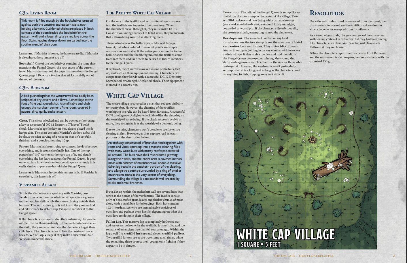Unbeknownst to either the village of Dahish or Lord Dansworth, White Cap Village, a trufflid settlement that resides not far away, is the root of their troubles. Recently, a few of the trufflids who were out exploring the surrounding area uncovered a relic of the demonic Fungal Queen and brought it back to their village. The relic, once unearthed, began to spread the evil influence of the Fungal Queen throughout the forest. Compelled by the forces within the relic, the trufflids and verdamites that live within the surrounding area have fervently worshipped her since.
